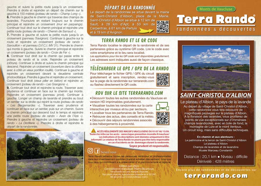 Au départ du village de Saint-Christol d’Albion, cette randonnée vous fera découvrir de magnifiques paysages sur le plateau d’Albion. A la floraison des lavandes, vous profiterez de points de vue exceptionnels sur d’immenses champs lavandicoles, avec en toile de fond, la montagne de Lure et le mont Ventoux. Un circuit long, mais sans difficultés techniques.